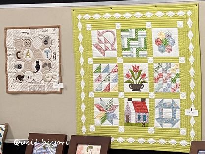 岡南公民館の展示をもう少し詳しくご紹介しますね。奥のパネルにはEさんのサンプラーキルトと可愛い猫のミニタぺを。ミニタペストリーは花岡瞳さん···