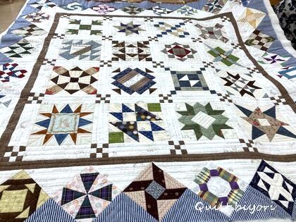 岡輝公民館のSさんのサンプラーキルトもずいぶんキルトが進みました。落ち着いた色合いが大人の雰囲気で素敵でしょう。シックなパターンの色のバラ···