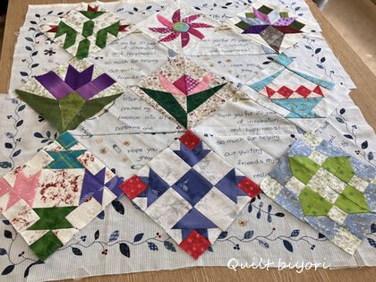 岡輝公民館のFさんのサンプラーキルトは色使いも柄使いも楽しいパッと明るく可愛いキルトです。配置が決まって、今は縫いつないでいるところ。パネ···