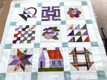〓生徒さんのキルト作りA.Rさん小さいブロックのログキャビンがたくさん並んだ シックな紫系のキルトのキルティング中です。落としキルトが終わった···