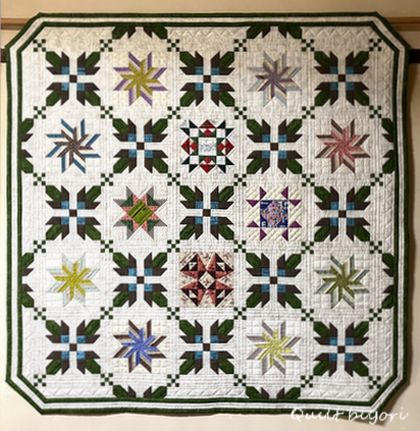岡南公民館のH.Tさんのサンプラーキルトです。今回はたくさんたまったサンプラーパターンをどうまとめるか、いろいろ並べてレイアウトを考えました···