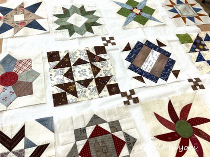 岡輝公民館のSさんのサンプラーキルトはパターンのレイアウトやラティスの幅などを決めているところです。焦げ茶の布を実物大に切って置いて様子を···